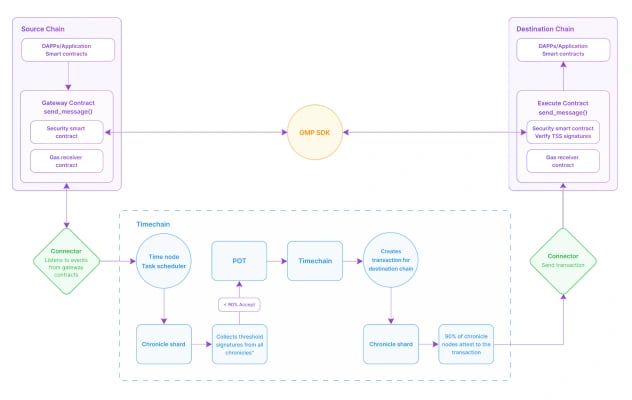 In a nutshell, the GMP protocol allows an application on the source chain (Chain X) to transmit a message to the destination chain (Chain Y). The process involves user/application interaction with the source chain's gateway smart contract, transaction fee prepayment, conversion of fees, authentication, TSS-based consensus, and validation on the Timechain.[6]